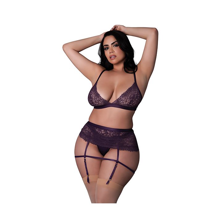 Leather & Lace Stretch Mesh and Lace Bralette w/Garter & Thong