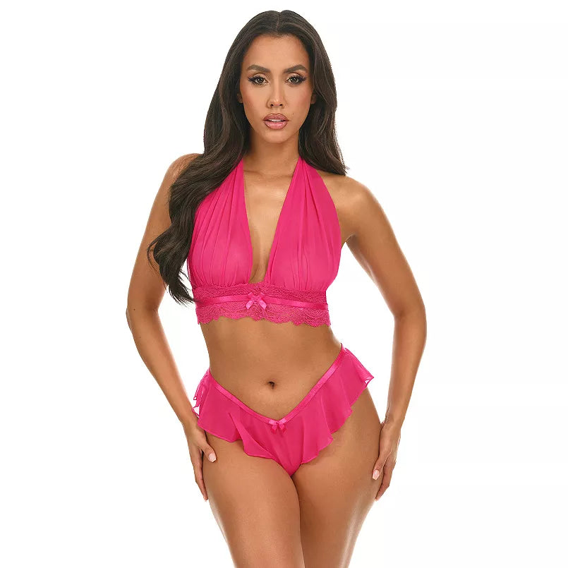 Effortlessly seductive and playful, the Maylah Mesh & Lace Halter Set is designed for flirty lounging and intimate adventures. Featuring a sheer mesh bralette with lace accents and high-cut tap shorts, this set brings a daring yet delicate allure to bedtime or beyond.