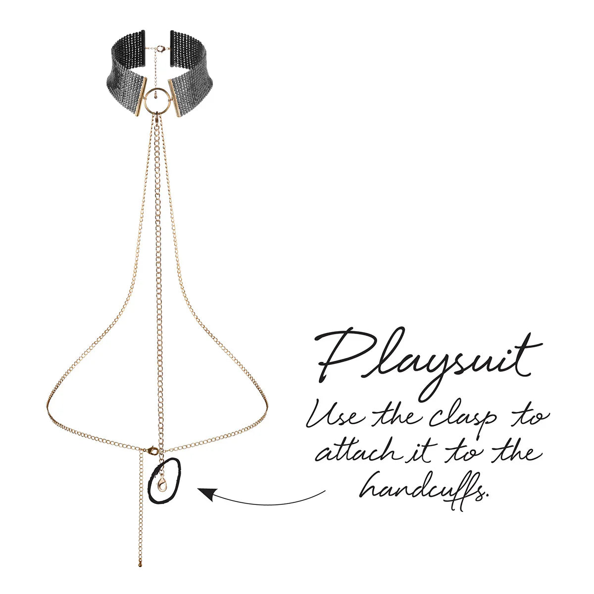 - Elegant chains drape the torso and waist, accentuating your curves.