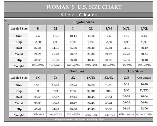 - Queen: Size 16-20 | Cup D/DD | Bust 40-54 in. | Waist 34-44 in. | Hip 42-56 in.