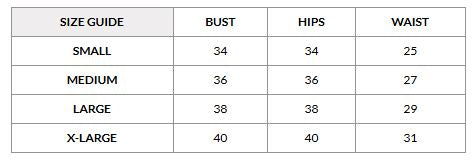 - Small: Bust 34-36 in. | Waist 25-27 in. | Hips 35-37 in.
