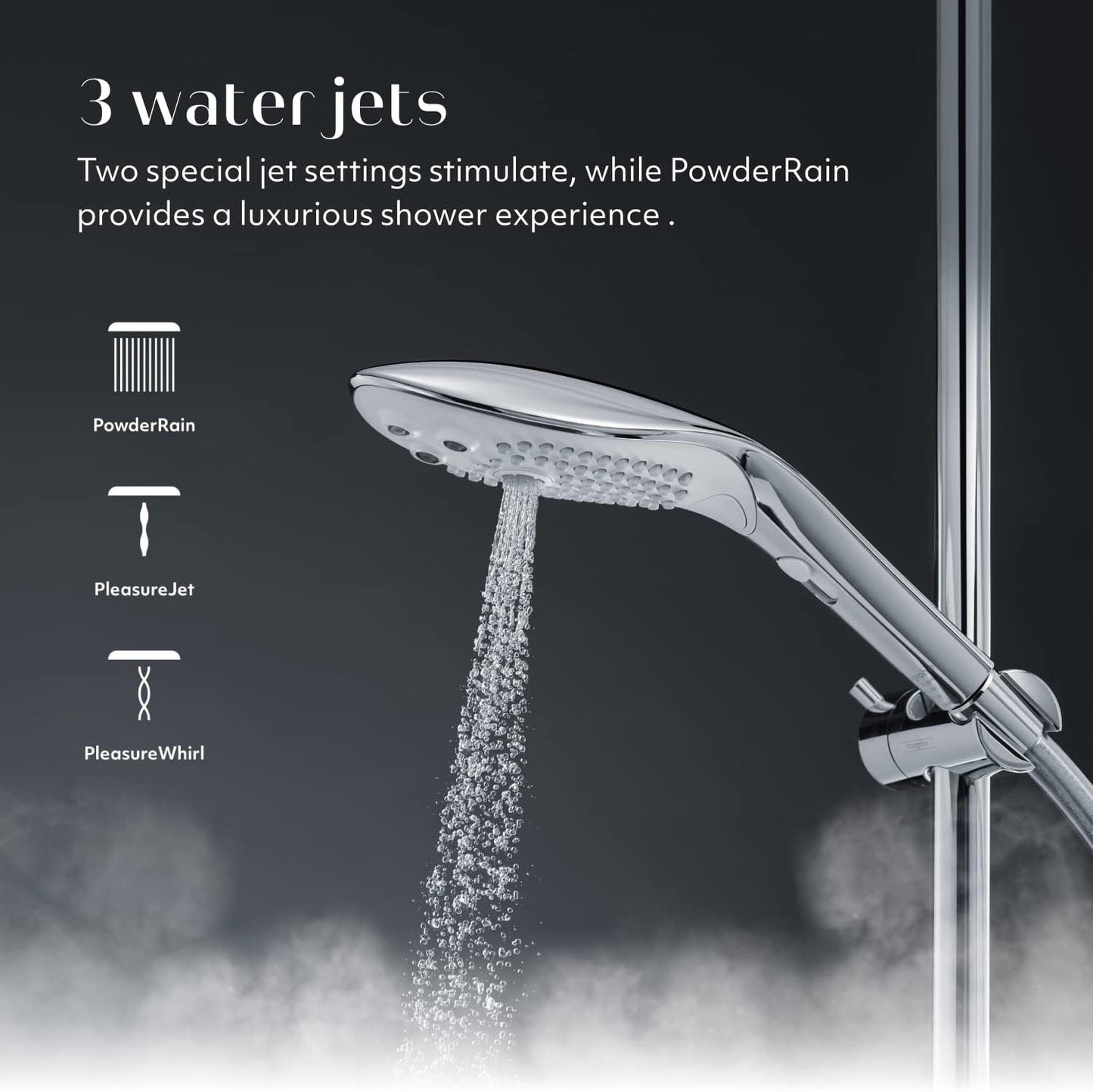 - Features three unique water jets: PleasureJet, PleasureWhirl, and PowderRain.